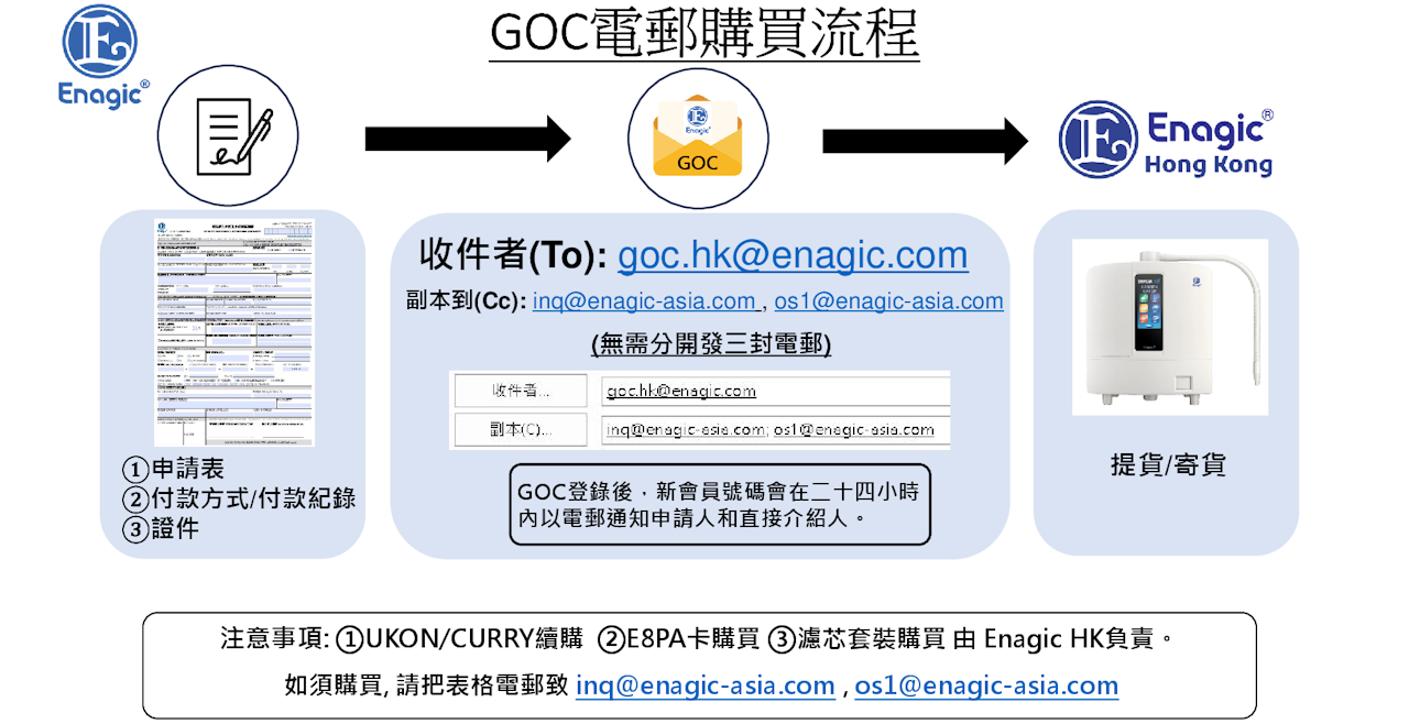 2025年11月1日起,香港分公司購買產品(水機、Anespa DX、Ukon/Curry、emGuarde、Kangen Air )的訂單僅可通過GOC Hong Kong電郵: goc.hk@enagic.com 辦理。
