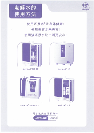 记载LEVELUK Super 501的相关情报 标示Super 501的性能以及( 还原水、净水、酸性水、强酸水 ) 所呈现的效果。拥有7层+5层的电解槽,Super 501目录说明具有丰富又简单明了的设计。